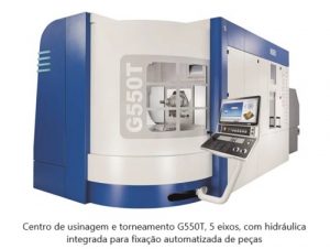 Um dos destaques do estande será o G550T, centro de usinagem e torneamento de 5 eixos com hidráulica integrada para fixação automatizada de peças — ampliando o potencial de automação.