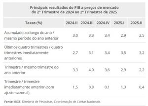 No mesmo período, a taxa de investimento foi de 16,8% do PIB, acima dos 16,6% do segundo trimestre de 2024. Já a taxa de poupança foi de 16,8%, superando os 16,2% do mesmo trimestre do ano passado.
