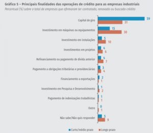 Nas operações de curto ou médio prazos (até cinco anos), 59% das empresas apontaram o capital de giro como a principal finalidade do crédito. Em seguida, aparecem o investimento em máquinas e equipamentos (15%) e o investimento em instalações (5%).