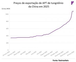 (01/02/2026) – No início de 2025, a China impôs limitações às exportações e à mineração de tungstênio (e outros 24 metais raros). A medida teve como um de seus principais reflexos aumentos constantes do preço da matéria prima do metal duro que, ao final do ano, simplesmente disparou. De janeiro a dezembro do ano passado, o preço subiu mais de 200% nos mercados internacionais.