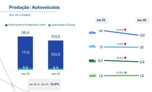 (08/02/2026) – Com a combinação de um mercado interno estável e menor volume de exportações, a produção de veículos totalizou 159,6 mil unidades em janeiro, queda de 12% na comparação com o mesmo mês do ano anterior.