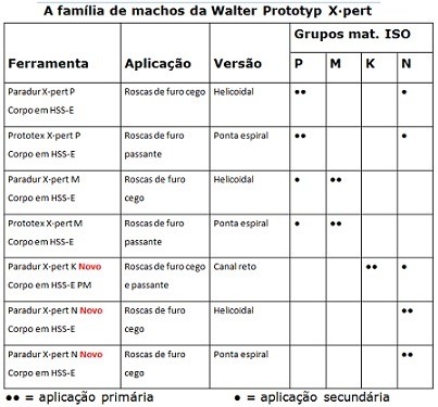 (24/08/2014) – A Walter está trazendo ao mercado mais versões da nova família de machos Prototyp Paradur X.pert. Para todos os tipos, a inscrição na haste indica em qual material as ferramentas alcançam a melhor performance, embora a empresa destaque que também há aplicação secundárias que podem ser feitas com eficiência. “Deste modo, a flexibilidade de toda a família, considerando os materiais P, M, K e N, é completa”, explica Martin Hellstern, Especialista de Produtos na Walter AG.