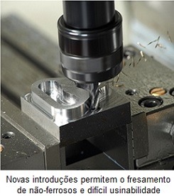 Por fim, diversas fresas de um ou dois canais oferecem a possibilidade de executar operações de fresamento em alumínio e outros materiais não-ferrosos. Todas apresentam superfícies polidas para diminuir o atrito entre a superfície da ferramenta e a peça, tornando o escoamento de cavacos mais rápido e eficiente, além de reduzir o tempo de parada da máquina. Há também a versão com cobertura de diamante real para materiais muito abrasivos, principalmente o grafite.