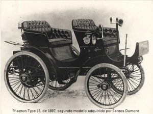 O carro em questão é o Peugeot Type 3 Vis-à-Vis, modelo que teve apenas 64 unidades produzidas entre 1891 e 1894. “Era uma curiosidade. Nesse tempo não existia ainda nem licença de automóvel nem exame de motorista. Quando alguém dirigia a nova invenção pelas ruas da capital, era por sua própria conta e risco”, relata Santos Dumont sobre suas primeiras voltas de carro pela França.